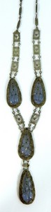 15 - CHINESE VINTAGE JADEITE & SILVER FILIGREE NECKLACE Chinese vintage silver filigree necklace with four carved lavender jadeite teardrop carvings. Marked to clasp. Each pendant measures 1 1/4" (3.2cm). Necklace measures 20" (51cm( round plus 3 1/4" (8cm) drop.