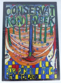 18 - HUNDERTWASSER CONSERVATION WEEK 1974 POSTER Friedrich Hundertwasser Conservation Week New Zealand 1974 original vintage poster. Offset lithograph with metal foil insets poster print. Signed in the plate lower left. Measures 23 1/2" (60cm) x 16 1/2" (42cm).