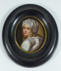 21 - MINIATURE PORTRAIT OF GIRL ON PORCELAIN Miniature continental hand painted portrait on an oval porcelain plaque depicting a young girl in a headdress, after the 'Portrait of Beatrice Cenci' by Guido Reni. KPM quality. Measures 2 5/8" (6.5cm) x 2 1/8" (5.4cm) +1" (2.5cm) frame.
