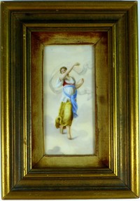 22 - CONTINENTAL PORCELAIN PLAQUE OF DANCING WOMAN Hand painted continental porcelain plaque depicting a dancer. Measures 5 1/2" (14cm) x 2 1/2" (6.5cm) + 2" (5cm) mat & frame.