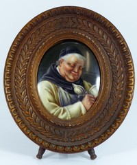 23 - GERMAN PORCELAIN PLAQUE OF MONK w STEIN German porcelain hand painted oval plaque depicting a monk holding a stein. Markings and stamps to back of plaque. Measures 3 1/4" (8cm) x 2 1/2" (6cm) + 1 1/4" (3cm) frame.