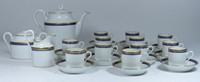 24 - 27pc RICHARD GINORI PORCELAIN DEMITASSE SERVICE 27 piece Richard Ginori Italian gold and cobalt China / porcelain tea set. Includes 12 cups-2 1/8", 12 saucers-4 1/4", teapot-7", sugar-5 3/4" and creamer-4". All pieces marked to bottom.