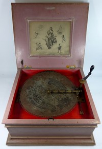 25 - ANTIQUE REGINA DISC MUSIC BOX Antique Regina disc music box. Believed to be oak, but has been painted. Includes one 15 1/2" disc. Music box measures 21" (53cm) x 19" (48cm) x 12" (30cm) height.