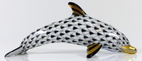 27 - HEREND HUNGARIAN BLACK FISHNET PORCELAIN DOLPHIN Herend Hungary hand painted black fishnet porcelain dolphin figurine. Marked to underside. Measures 4 1/4" (10.5cm) length.