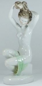29 - HEREND PORCELAIN FIGURINE OF NUDE FEMALE Herend Hungarian porcelain figure of a bathing nude female fixing her hair. Marked to bottom. Measures 14 1/2" (37cm) height.