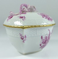 30 - HEREND PORCELAIN COVERED HEART BOX Herend Hungarian porcelain covered box with applied floral decoration. Box and lid have a band of basket weave texture and hand painted pink floral sprays. Marked to bottom. Circa 1930's or earlier. Box measures 5" (13cm) length.