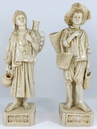 32 - PAIR ROYAL DUX PORCELAIN FIGURINES MAN & WOMAN Pair of Royal Dux porcelain figurines depicting a man and woman, presumably, heading to market. Man is depicted wearing a large hat and carrying several empty baskets. Woman is holding a pitcher in one hand with large amphora style vase on her back. Very nicely detailed in a light tan with brown and gold gilt accents. Woman impressed '79' and holds Royal Dux triangular red plaque. Man impress '78' no plaque. Largest measures 13" (33cm) height.