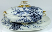 33 - ROYAL WORCESTER LIDDED TUREEN w UNDERPLATE Royal Worcester lidded tureen with underplate. Blue and white pine tree and floral design with gold gilt accents. Applied elephant head handles to tureen and bird-form handle to lid. All three pieces marked to underside. Tureen measures 12" (30.5cm) length. Underplate measures 14 1/2" (37cm) length.