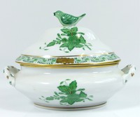 35 - HEREND CHINESE BOUQUET GREEN COVERED BOWL Herend Chinese Bouquet Green porcelain covered bowl / sugar with handles in the form of a miniature tureen. Applied bird finial to lid. Marked to bottom. Measures 5" (12.5cm) length.