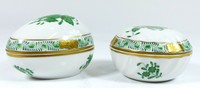 37 - 2pc HEREND CHINESE BOUQUET GREEN COVERED BOXES 2 Herend Chinese Bouquet Green porcelain covered boxes. One round and other is egg form. Each marked to bottom. Largest measures 2 3/4" (7.5cm) length.