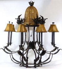 38 - MAITLAND SMITH VERDIGRIS IRON 8-LIGHT CHANDELIER Maitland Smith verdigris iron chandelier with rattan domes and five monkeys in various positions. Measures 57" (145cm) height x 43" (109cm) diameter.