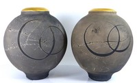 40 - PAIR OF CONTEMPORARY RAKU VASES ABSTRACT SIGNED Pair of contemporary Raku globular vases with abstract designs and gold gilt rims. Each signed to side and measures 12" (30.5cm) height.