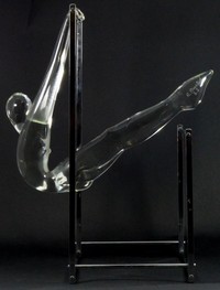 42 - ANATRA MURANO GLASS SCULPTURE GYMNAST UNEVEN BARS Renato Anatra Murano glass sculpture depicting a gymnast on the uneven bars. Signed to right foot. Glass sculpture measures 12 1/2" (32cm) length. Metal bars measure 15" height (38cm).