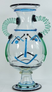 44 - RENATO ANATRA MURANO ART GLASS FACE VASE 19" Renato Anatra Murano art glass face vase with handles. Depicts a blue happy face to one side and a black sad face to opposite side. Signed to base. Measures 19 1/4" (49cm) height.