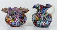 47 - 2pc MILLEFIORI ITALIAN ART GLASS CREAMER & SUGAR Millefiori Italian art glass creamer and sugar. Creamer has frosted handle and measures 3" (7,5cm) height.