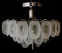 48 - MODERN FROSTED GLASS MEDALLION CHANDELIER Modern chandelier with oval frosted glass medallions and chrome canopy. Underwriters Laboratories sticker inside canopy. Measures 13 1/2" (34cm) diameter 9 1/2" (24cm) height.