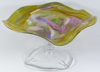 49 - LARGE STUDIO ART GLASS CENTERPIECE BOWL SIGNED Large studio glass footed centerpiece bowl with golds, greens and purples. Signed to bottom T KC (?) 2008. Measures 18" (45.5cm) diameter x 10" (25.5cm) height.