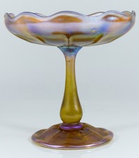 4 - LOUIS C TIFFANY GOLD FAVRILE ART GLASS COMPOTE Louis Comfort Tiffany Favrile iridescent art glass compote having scalloped rim dish raised on a baluster form stem. Signed L.C.T. Favrille to bottom. Measures 6" (15cm) height.