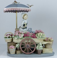 50 - LLADRO FIGURINE 'FLOWERS OF THE SEASON' #1454 Lladro porcelain figure 'Flowers of the Season' #1454, designed by Jose Puche and first introduced in 1983. It depicts a young girl standing along side her cart filled with Spring flowers. Three small birds rest upon the top of her umbrella. Marked to bottom. Measures 11 3/4" tall (29cm) by 10" wide (25cm).