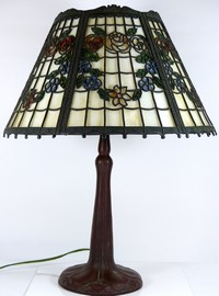 8 - HANDEL BRONZED LAMP BASE w METAL OVERLAY SHADE Handel bronzed metal lamp base. Signed to bottom. Six panel slag glass lamp shade with painted floral decorations and metal overlay. No apparent signature to shade. Base measures 20 1/2" (52cm) height. Shade measures 15 1/2" (39.5cm) diameter.