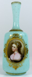 9 - FRENCH MILK GLASS HAND PAINTED PORTRAIT VASE French milk glass vase, stained teal. Hand painted portrait of woman to front with gold gilded designs throughout. Measures 6 3/4" (17.5cm) height.