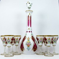 10 - 9pc BOHEMIAN WHITE CUT TO CRANBERRY CORDIAL SET 8 Bohemian Czech white cut to cranberry glass liquors / cordials with gilt rim and 1 large matching decanter with stopper. Cordials measure 5 1/4" (13cm) height. Decanter measures 15 1/2" (39.3cm) height.