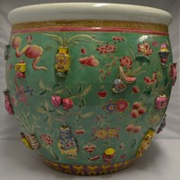 15 - CHINESE GREEN GROUND FAMILLE ROSE FISH BOWL 19th century Chinese green ground famille rose bowl with applied decorations. Measures 16" (40.5cm) diameter x 15" (38cm) height.