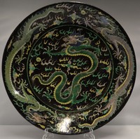 16 - CHINESE BLACK GROUND FAMILLE VERTE CHARGER 18th century Chinese black ground famille verte charger depicting dragons and clouds. Marked to underside. Measures 16 3/4" (42.5cm) diameter.