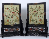 17a - PR CHINESE JADE PLAQUES w CARVED STANDS Pair of Chinese jade plaques / table screens inlaid with semi-precious stones including agate, turquoise, jade and amethyst. Each set in a finely carved and reticulated wooden stand. Each measures 13 1/2" (34cm) height.