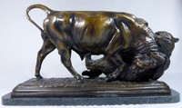24 - BRONZE BULL & BEAR SCULPTURE AFTER I. BONHEUR Bronze sculpture depicting the battle of bull and bear after Isidore Jules Bonheur (French 1827 - 1901). Signed to bronze base and dated 1900. Bronze measures 20" (51cm) length x 11 1/2" (29cm) height + 3/4" (2cm) marble base. Weight approx 59lbs.