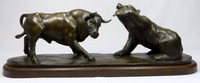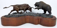 29 - S. BUDGE BRONZE SCULPTURE OF BULL & BEAR Bronze sculpture depicting a fighting bull and bear. Signed twice to bronze base "S. BUDGE". Bronze measures 23 1/2" (59.5cm) length x 8 1/2" (21.5cm) height + 1" (2.5cm) wood base. Weight approx 36.5lbs.