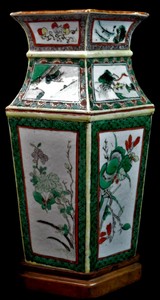 31 - CHINESE FAMILLE VERTE PORCELAIN VASE w WOOD STAND 19th century Chinese Famille Verte porcelain vase. Each side having three hand painted panels depicting various florals and landscapes. Measures 10" (25.5cm) height.