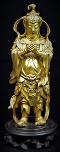 33 - CHINESE GOLD GILT BRONZE BUDDHA FIGURE 18th century Chinese gold gilt bronze figure depicting a standing buddha. Measures 8 3/4" (22.5cm) height.