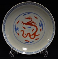 34 - CHINESE BLUE & WHITE CORAL RED PORCELAIN PLATE 19th century Chinese blue & white with coral porcelain plate. Depicts a dragon surrounded by clouds. Six character calligraphy mark inside of double circle to underside. Measures 10 1/4" (26cm) diameter.