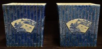 36 - PR CHINESE BLUE & WHITE BAMBOO PORCELAIN PLANTERS Pair of 19th century Chinese blue and white porcelain planters with textured bamboo stalk pattern throughout. Having fan shaped plaques to sides depicting landscapes and calligraphy. Each piece marked to underside and measures 6 1/2" (16.5cm) height 6 1/4" (16cm) depth.