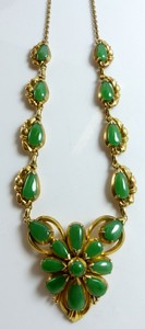 36a - CHINESE 14kt YELLOW GOLD JADEITE CABOCHON NECKLACE 14kt yellow gold necklace with 18 teardrop and 1 round apple green jadeite cabochons. Marked 14K to back of pendant and also to clasp. Measures 17 1/2" (44.5cm) length. Total weight 13.8dwt (21.5g).