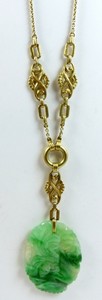 36b - CHINESE JADEITE PHOENIX PENDANT w 14kt YG NECKLACE Reticulated jadeite phoenix pendant with 14kt yellow gold necklace. Marked 14K to clasp. Jadeite pendant measures 1 1/2" (3.7cm). Necklace measures 16" (40.5cm) length with a 2 1/2" (6.3cm) drop. Total weight 8.2dwt (12.7g).