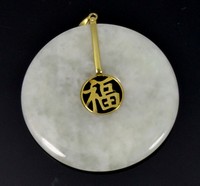 36c - CHINESE JADEITE DISC PENDANT w 14kt YELLOW GOLD Chinese jadeite disc pendant with 14kt yellow gold bail and calligraphy to center. Marked 14K to inside of clasp. Measures 2 1/4" (5.5cm). Total weight 18.6g.