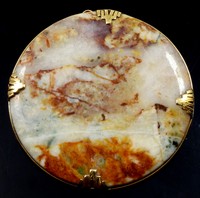 36d - 14kt YG CHINESE CARVED STONE DISC PENDANT BROOCH Chinese carved stone disc with 14kt yellow gold mounts. Can be worn as a pendant or brooch. Marked 14K to inside of bail. Measures 2 13/16" (7cm) including bail. Total weight 39.2g.