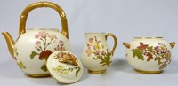 38 - 3pc ROYAL WORCESTER PORCELAIN TEA SET 3pc Royal Worcester porcelain tea service including teapot, sugar and creamer. Each piece having faux bamboo handles, gilt accents and hand painted floral motif. Each piece marked to underside. Teapot measures 7" (18cm) height.
