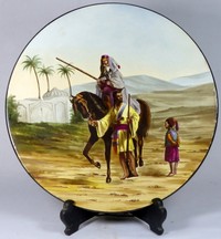 40 - HAND PAINTED CERAMIC CHARGER ORIENTALIST SCENE Hand painted ceramic charger depicting two Arab men with guns with a young child to their left. Measures 13" (33cm) diameter.