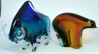 45 - PR NASON MURANO BULL & BEAR GLASS SCULPTURES Pair of Nason Murano glass sculptures depicting a bull and bear. Bull fades from a teal to cobalt blue and measures 12" (30.5cm) length. Bear fades from orange to teal and measures 10" (25.5cm) length.