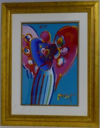 5 - PETER MAX 'ANGEL WITH HEART' MIXED MEDIA PAINTING Peter Max mixed media painting with acrylic and color lithography on paper. Titled 'Angel with Heart'. Signed lower right in acrylic. Includes appraisal from Park West Gallery. Measures 24 1/2" (62cm) x 16 1/2" (42cm) + 6" (15cm) mat & frame.