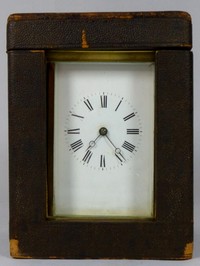 7 - BREVETES BRASS CARRIAGE CLOCK w CASE & KEY Brevetes brass carriage clock white enamel face with roman numerals. Includes fitted case with key. Retailed by E.B. Booth & Son, Rochester N.Y. Impressed under bottom plate "BREVETES.C.D.L. H.A" Clock measures 5 1/4" (13cm) height + handle.