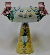 8 - BJORN WIINBLAD VINTAGE POTTERY FIGURAL COMPOTE Bjorn Wiinblad (Danish, 1918-2006) vintage pottery compote depicting a smiling girl holding a cup. Marked to inside of base. Measures 12" (30.5cm) height x 11" (28cm) width.