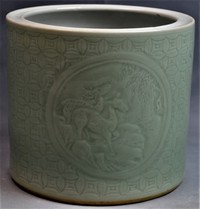 11 - 19th C CHINESE CELADON GLAZED PORCELAIN BRUSH POT 19th century Chinese celadon (DouQing) glazed porcelain brush pot having round panels depicting deer among the trees. Measures 7 1/2" diameter x 6 1/2" (16.5cm) height.