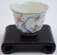 13 - 19th C CHINESE BLUE & WHITE VERTE PORCELAIN CUP 19th century Chinese blue and white Famille Verte porcelain wine cup with gilt rim. Six character calligraphy mark to underside. Measures 2 7/8" (7.4cm) diameter x 2 1/8" (5.4cm) height + base.