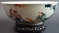 14 - 19th C CHINESE FAMILLE ROSE PORCELAIN BOWL 19th century Chinese Famille Rose porcelain bowl with various depictions of elders. Having pomegranates and bats to interior and archaic calligraphy mark to underside. Measures 10" (25.5cm) diameter x 3 3/4" (9.5cm) height.