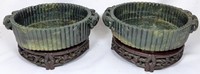 15 - PR CHINESE SPINACH JADE MARRIAGE BOWLS Pair of Chinese spinach jade ceremonial marriage bowls having stylized bamboo sides and dragon form handles. Each having for feet and seated upon a fitted carved wooden stand. Each measures 11 1/2" (29cm) x 9 3/4" (25cm) x 3 1/8" (7.8cm) height + 2 1/2" (6.3cm) stand. Jade weight is just over 5.6kg.
