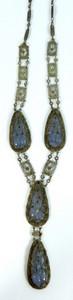 19 - CHINESE VINTAGE JADEITE & SILVER FILIGREE NECKLACE Chinese vintage silver filigree necklace with four carved lavender jadeite teardrop carvings. Marked to clasp. Each pendant measures 1 1/4" (3.2cm). Necklace measures 20" (51cm) round plus 3 1/4" (8cm) drop.
